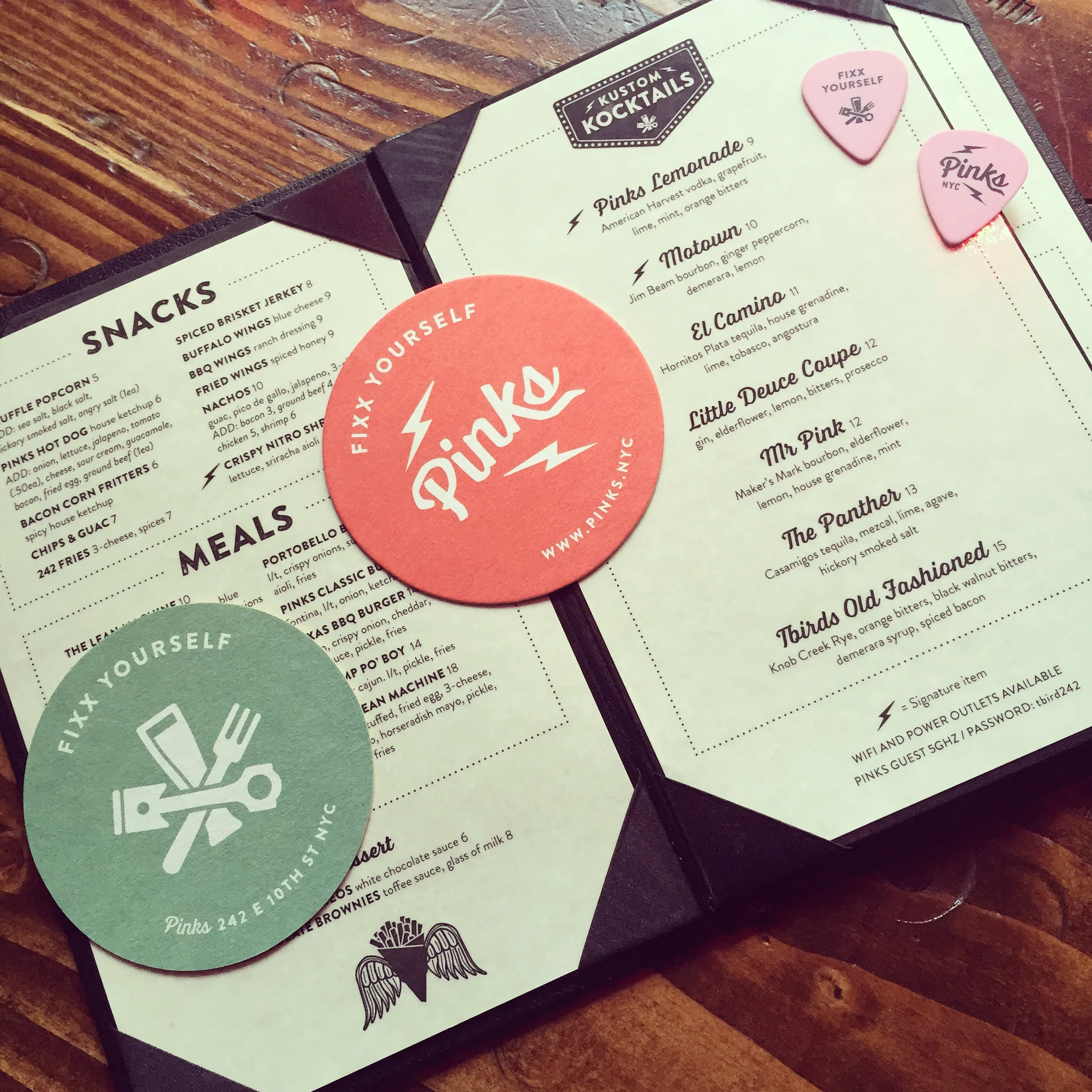 Pinks is a rock’n’roll ‘Kustom Kulture’ inspired bar and eatery in the East Village. Hot Rods, drag racing, tikis, pinstripes, pinup girls, DIY and art (Ed "Big Daddy" Roth and Rat Fink, Von Dutch). It was quite fun to explore and see this brand come to life, including some play in copywriting.